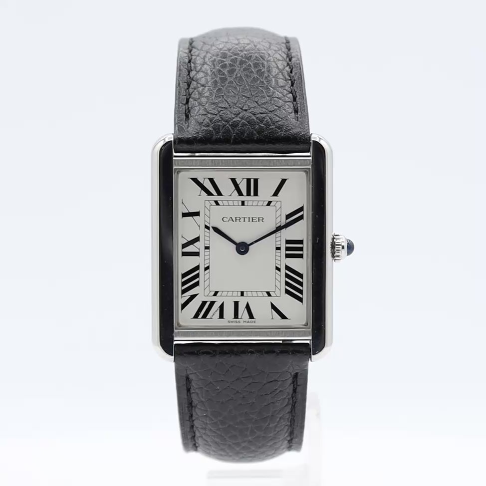 - Additional Information: The Cartier Tank Solo Large Model, is a classic, elegant watch featuring a polished stainless steel rectangular case, a silver opaline dial with bold black Roman numerals, blued-steel sword hands, and a synthetic cabochon-set crown, all powered by a reliable quartz movement and presented on a black leather strap with a steel deployant clasp, known for its iconic design and versatile, understated luxury.