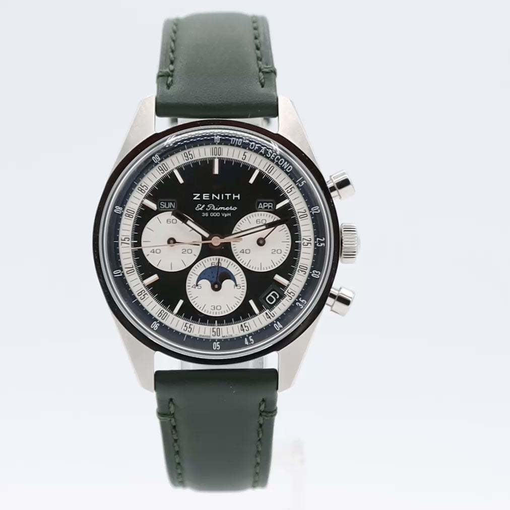 Additional Information: The Zenith 03.3400.3610 is a Chronomaster Original Triple Calendar watch featuring a 38mm stainless steel case, a forrest green dial, and the El Primero 3610 automatic movement. It includes a chronograph with 1/10th of a second precision, a moon phase, and a triple calendar for the day, date, and month. The watch has a 60-hour power reserve and is water-resistant up to 50 meters.