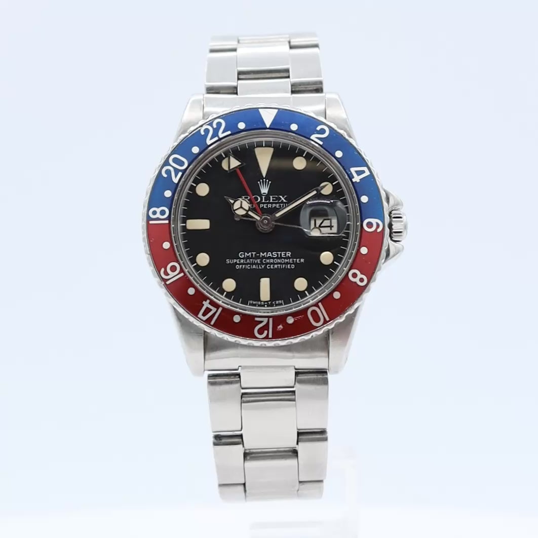 • Additional Information: The Rolex GMT-Master Ref. 1675 "Pepsi" is an iconic vintage wristwatch, produced from approximately 1959 to 1980, known for its red and blue "Pepsi" bezel, acrylic crystal, 40mm stainless steel case with crown guards, and a self-winding movement. This reference features various dial and movement updates throughout its production, such as early gilt dials that later transitioned to matte dials and the use of caliber 1575 movement. Its historical significance as a pilot's tool watch, especially its association with NASA's Apollo 11 mission, has made it a highly sought-after collector's item. This model featured was produced circa 1979, and features a crisp and even dial patina with large creamy lume plots. The case is overall in good case and sparingly polished.