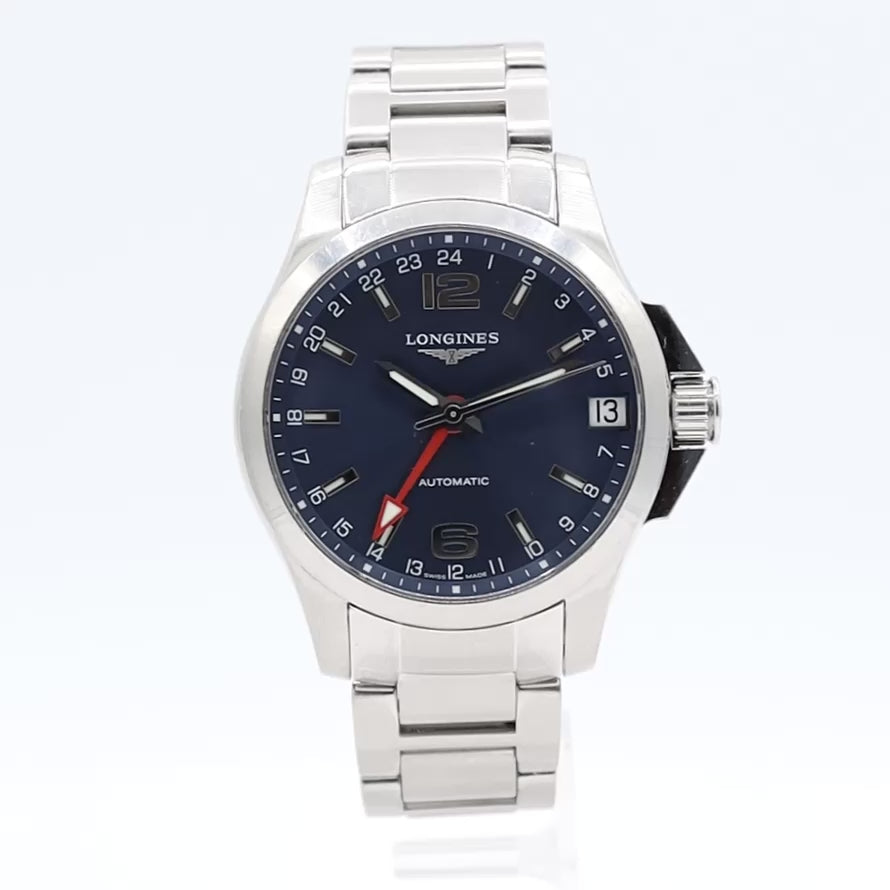 - Additional Information: The Longines Conquest GMT L3.687.4.99.6 is an elegant automatic men's watch known for its versatility as an everyday watch and a business-appropriate timepiece, featuring a GMT (Greenwich Mean Time) function for tracking a second time zone. It features a distinctive blue dial and a robust stainless steel construction.