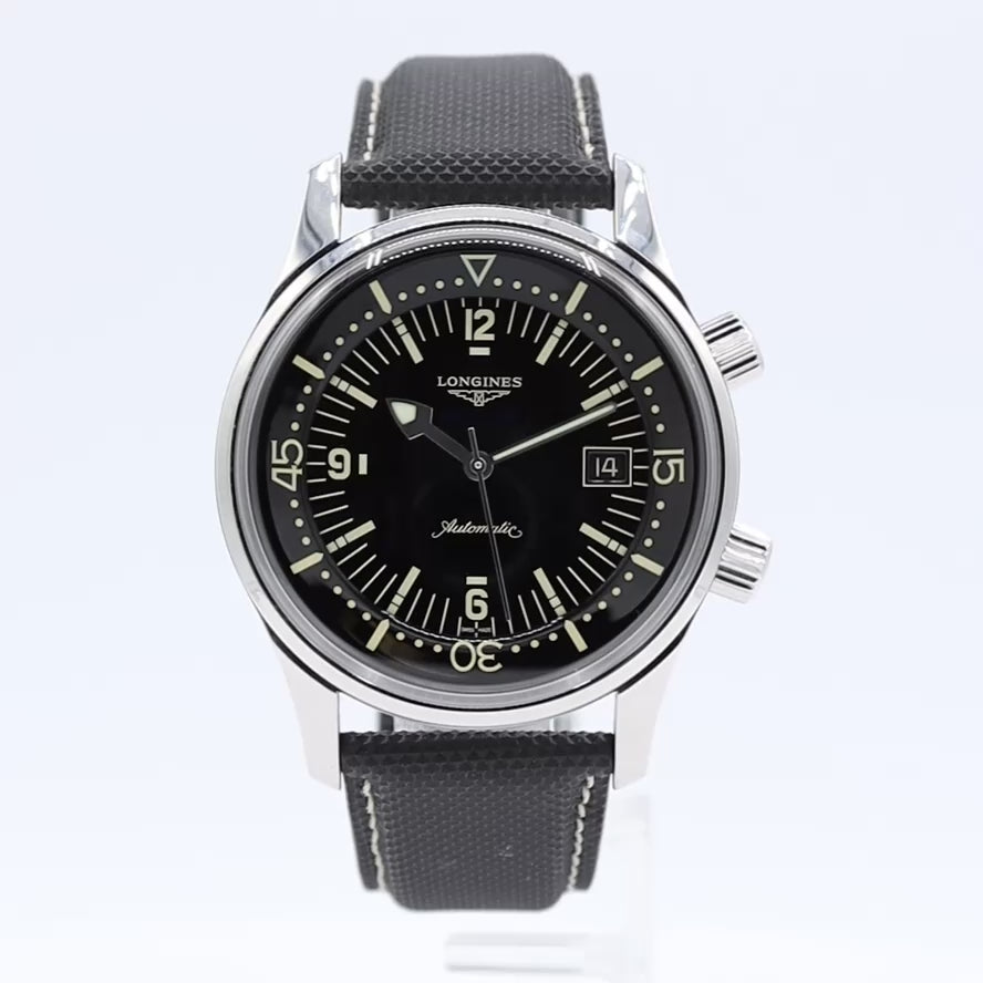 Additional Information: With Box and User Manual. The Longines L3.774.4.50.0 is a 42mm automatic watch with a black lacquered dial, a stainless steel case, and a black fabric strap. It features a 300-meter water resistance rating, an internal rotating dive bezel controlled by the top crown, a screw-down crown for setting, and a sapphire crystal. The movement is a Swiss automatic caliber, the L888, providing a power reserve of approximately 72 hours. The watch is a modern reinterpretation of a 1960s Longines diving watch.
