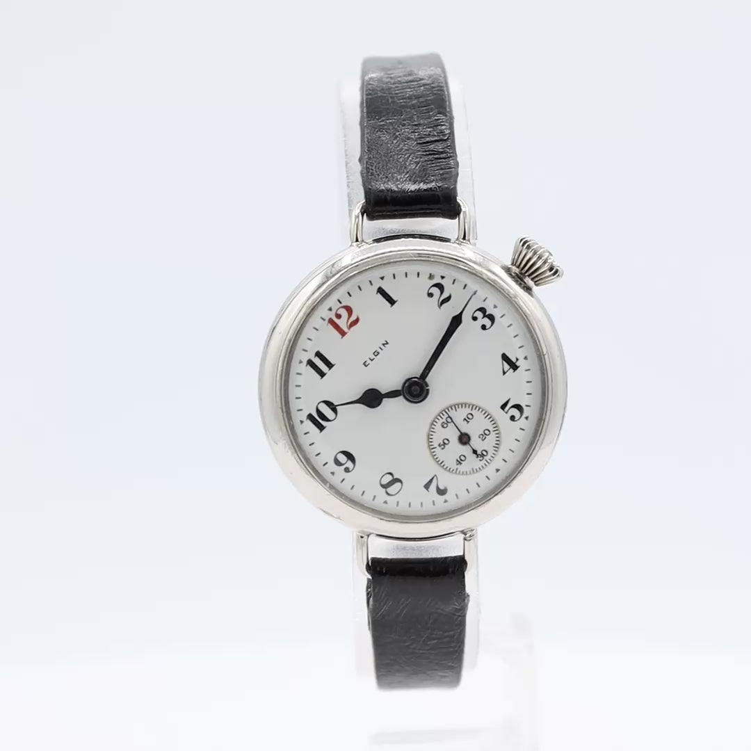 • Additional Information: Elgin "trench watches" of 1918 were created to address the need for a practical timepiece on the front lines of World War I. Prior to the war, pocket watches were standard for men, but in-the-moment trench warfare made using them impractical. These early wristwatches were an American invention born of necessity, created by adding soldered-on wire lugs to standard pocket watches, enabling them to be worn on the wrist. The 1918 model was a popular choice for soldiers, and variations were also marketed to the public as "victory watches" after the war ended.