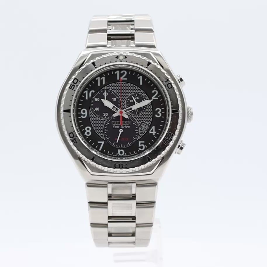 - Additional Information: The chronograph function on Citizen H500 Eco-Drive watch acts as a stopwatch, capable of measuring elapsed time, and it operates using the two push buttons on the side of the case. This watch is solar-powered and never requires a battery replacement as long as it's exposed to light.