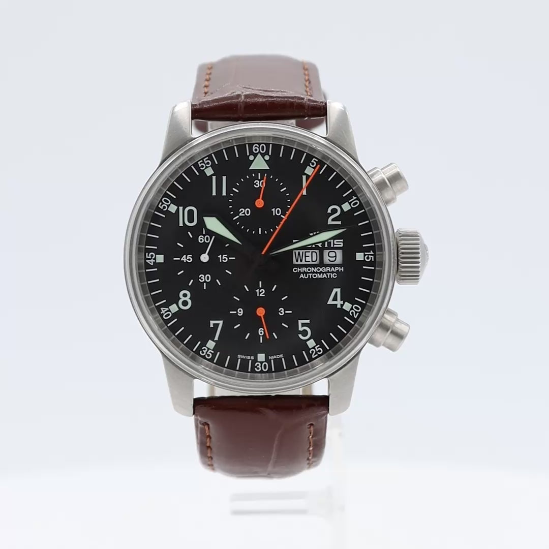 Additional Information: The Fortis 597.11.141.1 is a discontinued Flieger B-42 Chronograph, a men's pilot's watch known for its professional-grade features and high legibility. This model belongs to the Fortis "Flieger" line, first introduced in 1987 for aviation professionals.