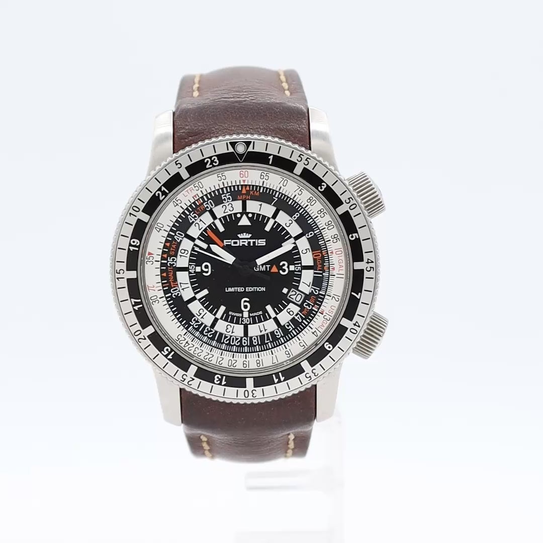 Additional Information: With Box and User Manual. No. 358 of 2012. The Fortis 669.10.148 is a men's Fortis B-47 GMT Calculator Limited Edition automatic wristwatch with a 47mm stainless steel case, a black dial, and a brown leather strap. It features a bidirectional rotating bezel with a slide-rule for calculations, a GMT function for three time zones, a date display, and is water-resistant up to 200 meters. The watch is powered by a Swiss automatic movement and has luminous hands and hour markers