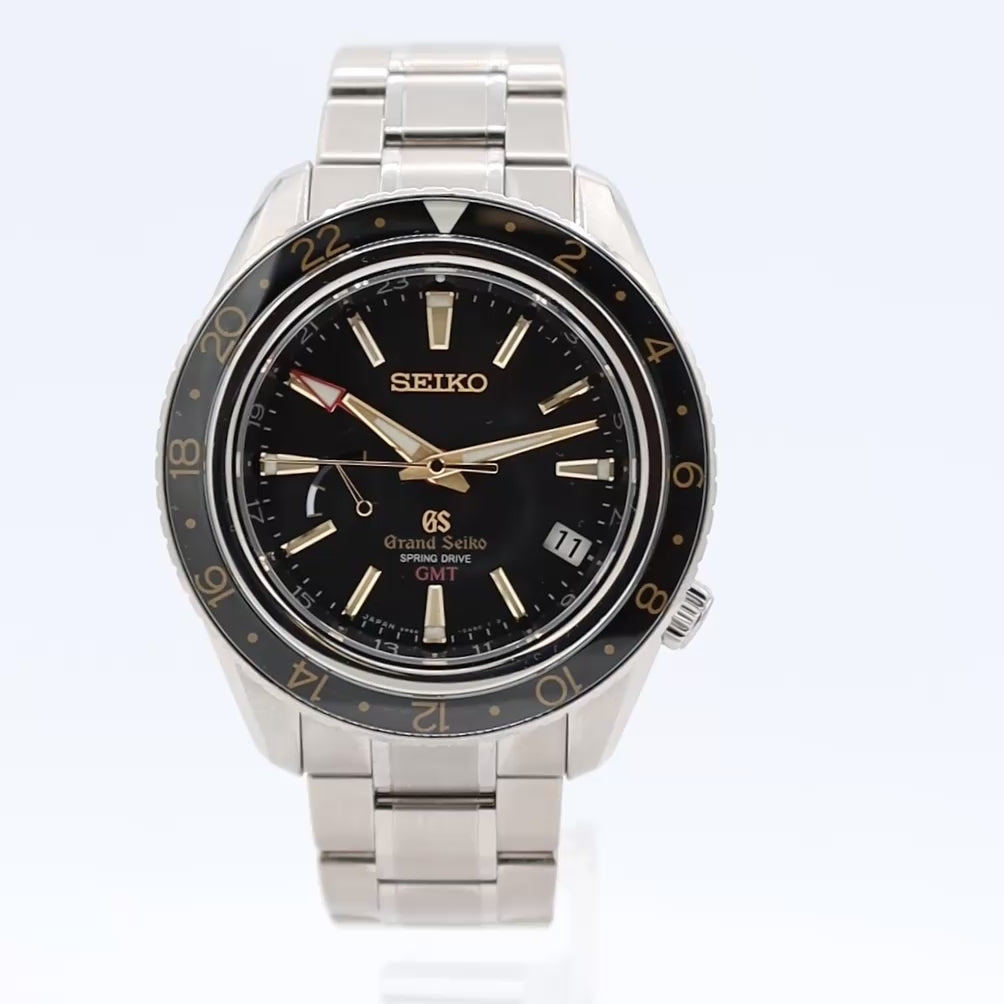 Additional Information: With Box including documentation and extra links. The Grand Seiko SBGE215 is a Sport Collection GMT watch featuring a high-intensity titanium case, a black dial, and a unique Spring Drive GMT movement. Key features include a sapphire-capped bezel with a 24-hour scale, a red GMT hand, and a power reserve indicator on the dial. This timepiece combines durability and high-performance with GMT functionality for travel and a 200-meter water resistance.