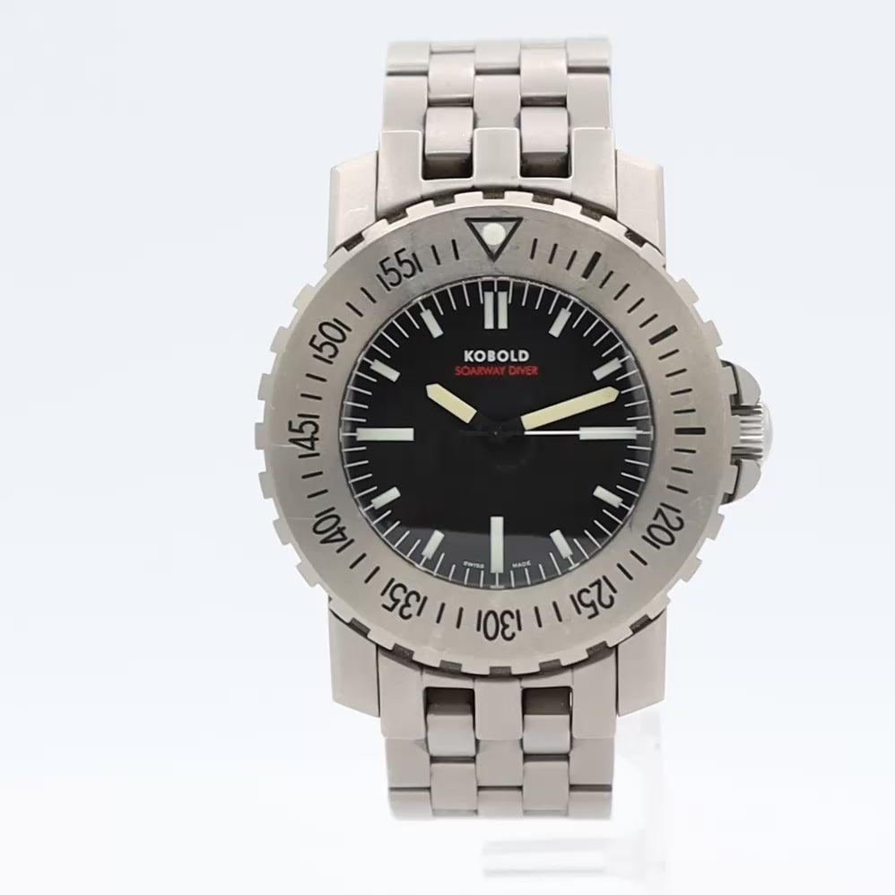 - Additional Information: Purposeful Kobold Soarway "Seal" Diver with box and NATO style strap. Titanium shows wear especially on bracelet and some on case. Large scratch on caseback. Currently sized for a 7" wrist, one extra link.