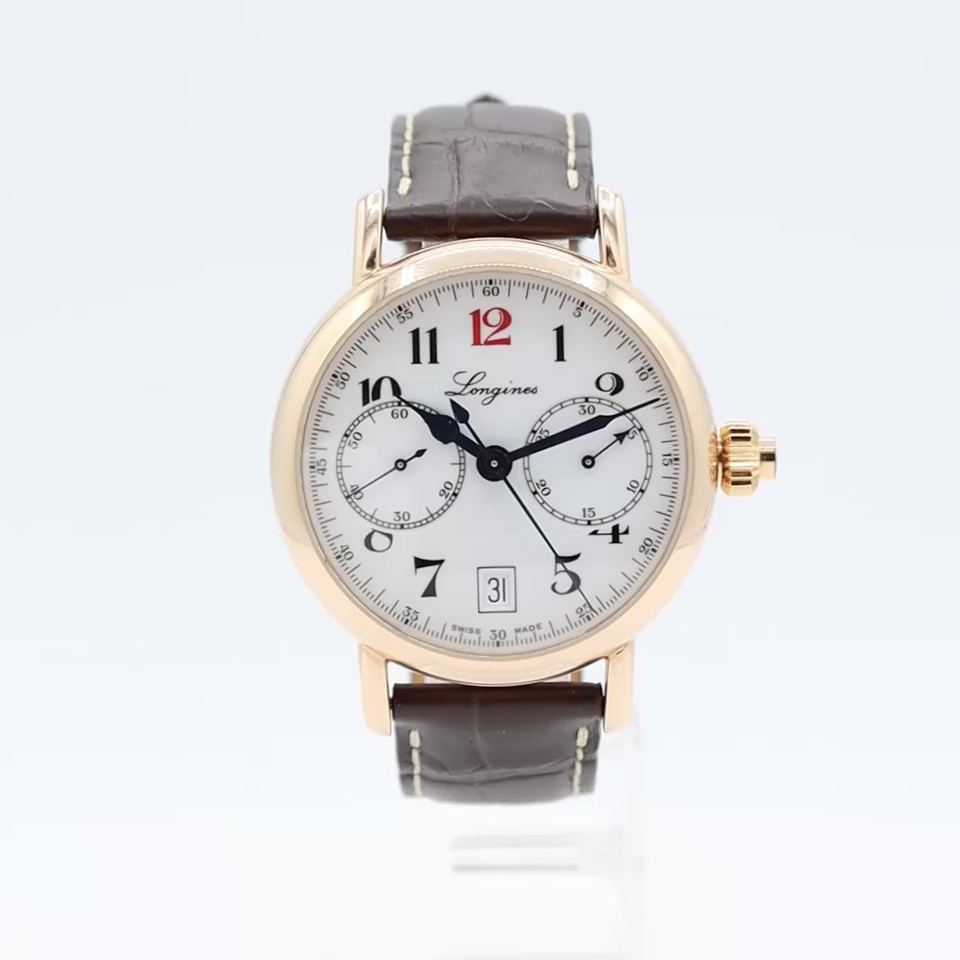 Additional Information: With Box and User Manual, No.253. The Longines L2.775.8.23.3 is an 180th Anniversary limited edition watch from the Heritage collection, featuring an 18k gold case, a white lacquered dial with black Arabic numerals and a red "12", and a single-pusher column-wheel chronograph. It is powered by the Longines Caliber L788 automatic movement, has a 40mm diameter, a brown alligator-patterned leather strap, and is water-resistant to 30 meters.
