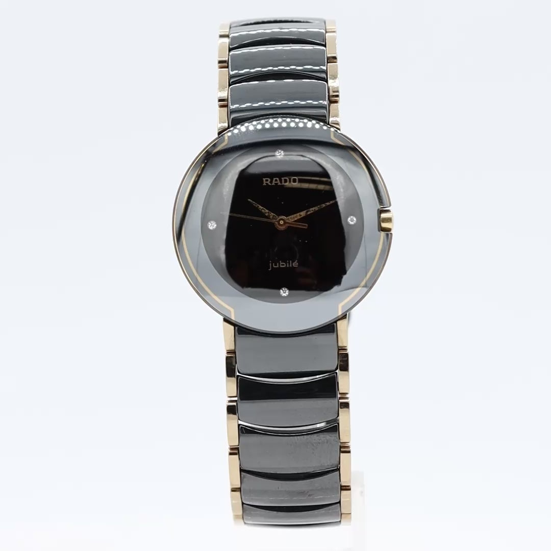Additional Information: Rado Diastar Jubile Reference # 129.0300.3 32mm Gold Tone Titanium Black Ceramic 4 Diamond Dial Quartz Watch in excellent pre-owned working condition. This watch by Rado from their Diastar Jubile line features a 32mm titanium watch case with black ceramic and gold tone accents, black dial with (4) diamond hour markers and gold tone hands, Rado gold tone titanium and black ceramic bracelet with a push button deployant clasp and fine Swiss made quartz (battery operated) movement