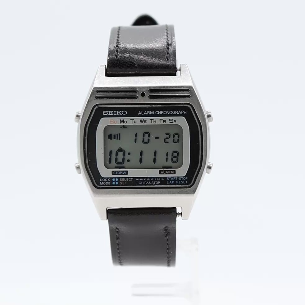 Additional Information: The Seiko A257-5010 is a vintage 1980s digital LCD alarm chronograph wristwatch with a stainless steel case. Key features include a stopwatch/chronograph, alarm, hourly chime, and backlight. The A257 is a quartz movement model made in Japan and is known for its classic, affordable design, often found in a silver color with a screw-back case.