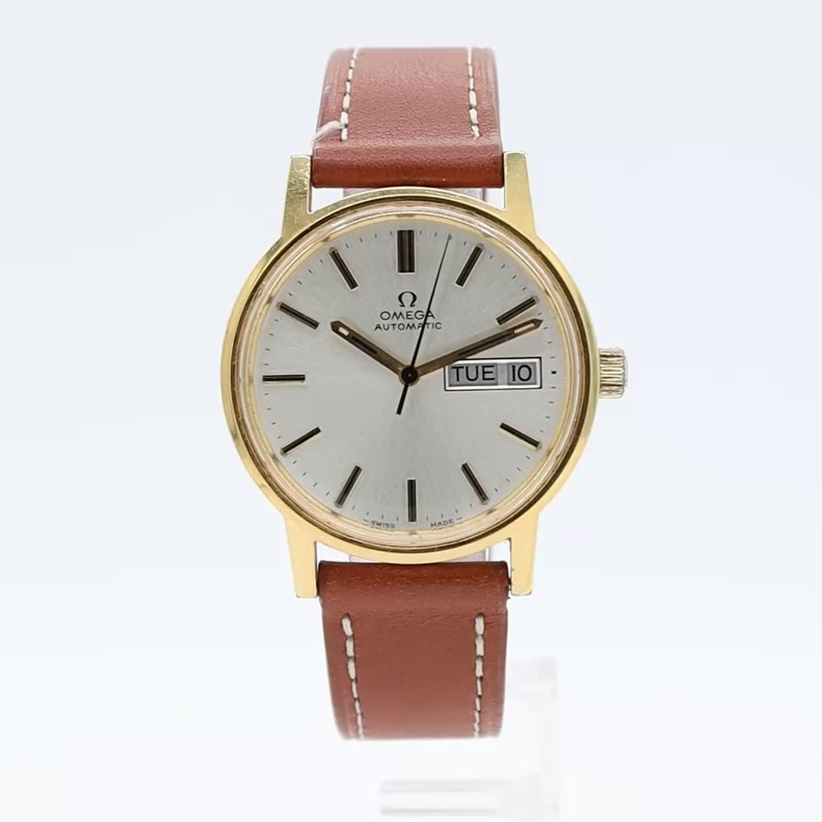 Additional Information: The Omega reference 166.0117 is a vintage automatic wristwatch produced in the early 1970s, part of Omega’s elegant yet accessible Genève line. It features the reliable Omega Calibre 1020 with both day and date complications positioned at 3 o’clock. The case measures about 35 mm in diameter, giving it a classic mid-century dress watch proportion. The watch is fitted with an acrylic (plexiglass) crystal. This model features a silver sunburst finish, giving the watch a distinct vintage character.