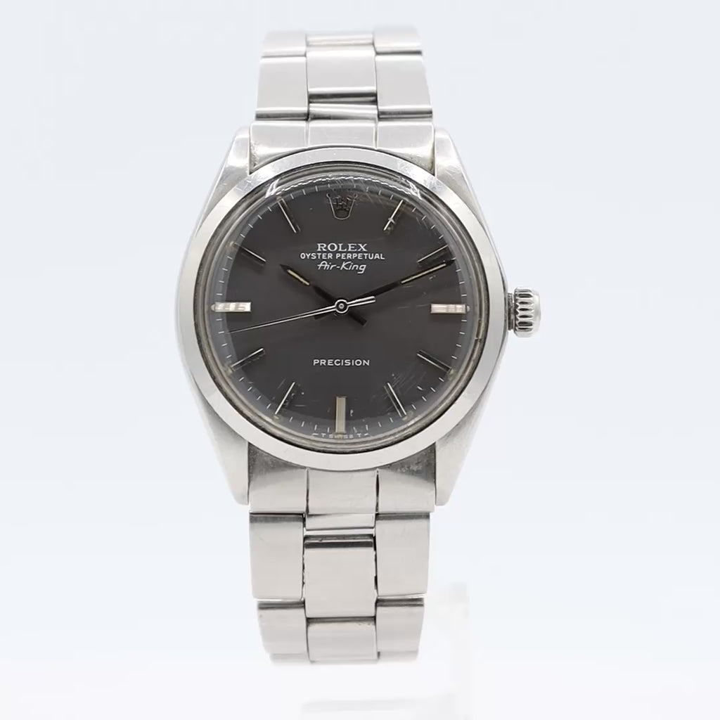 Additional Information: Produced in 1975 this Rolex Air-King ref. 5500 is a vintage, self-winding wristwatch, known for its simple, classic design and 34mm Oyster case. It is a time-only watch, lacking complications like a date display, which contributes to its understated and versatile style.