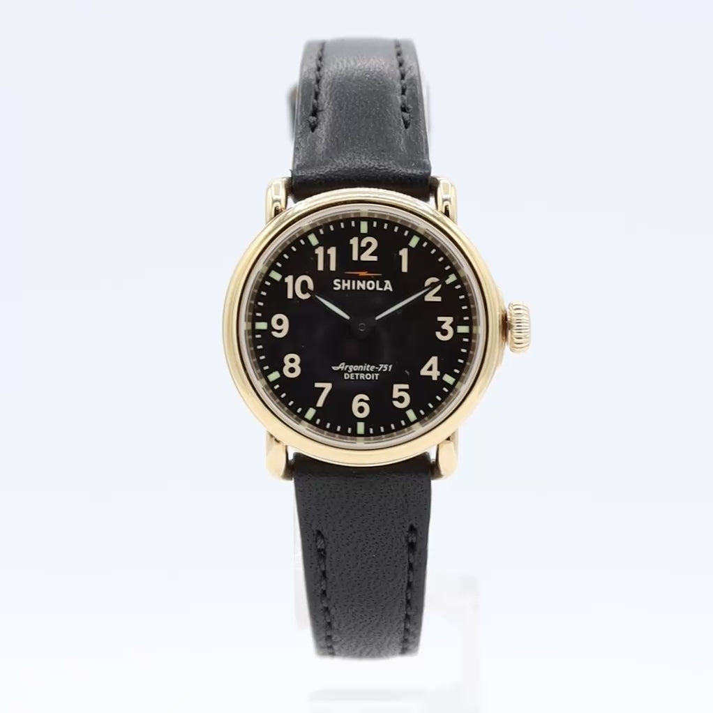 Additional Information: This Shinola Runwell features a crisp black dial surrounded by gold-tone stainless steel. Small and compact, the watch aims for a dressy and refined look.