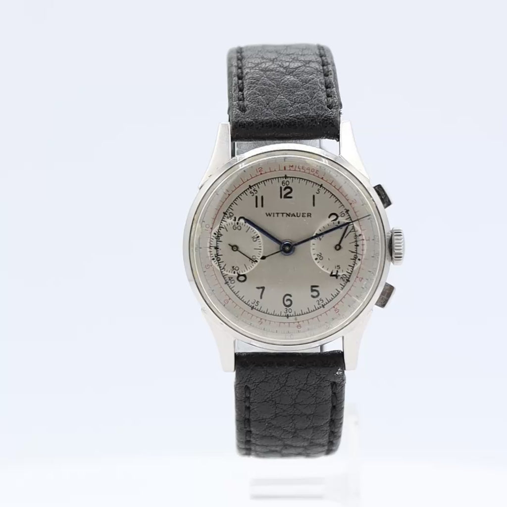 Additional Information: A Wittnauer chronograph featuring a Venus 150 movement is a vintage watch, typically from the 1940s or 1950s, that includes a column wheel chronograph, a mechanical movement known for its smooth operation. The Venus 150 movement itself, produced by the Venus company which was renowned for its high-quality chronographs, features a central chronograph seconds hand, a 30-minute counter, and a small seconds sub-dial. Early models were monopusher designs, while later versions commonly seen today have two pushers and a 7-column wheel
