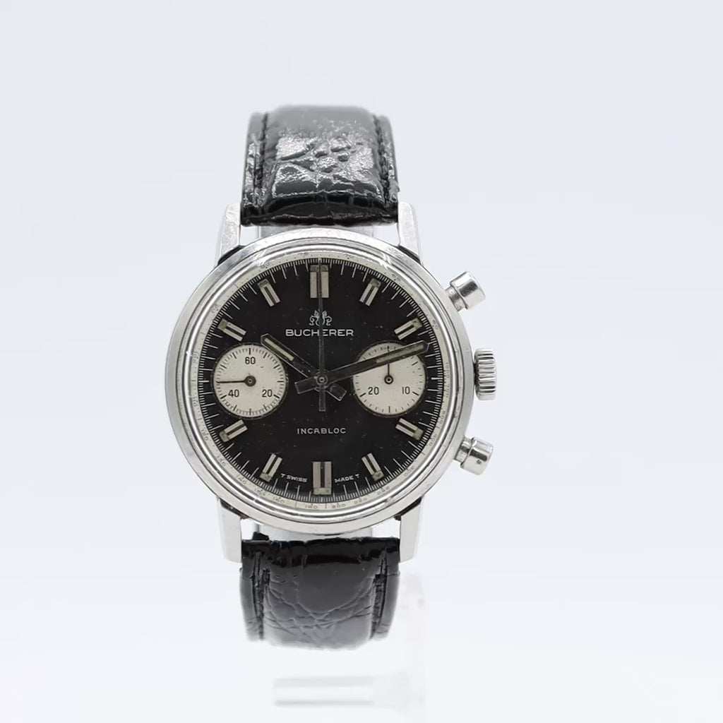 Additional Information: This Bucherer with Landeron 248 is a vintage wristwatch that combines a Bucherer brand case with a manual-winding Landeron 248 chronograph movement. This movement is known for its 1960s popularity, two-button operation, and function as a cam-switched chronograph with a 30-minute register at 3:00 and a running seconds subdial at 9:00. This model features a stainless steel case and a 35mm diameter.
