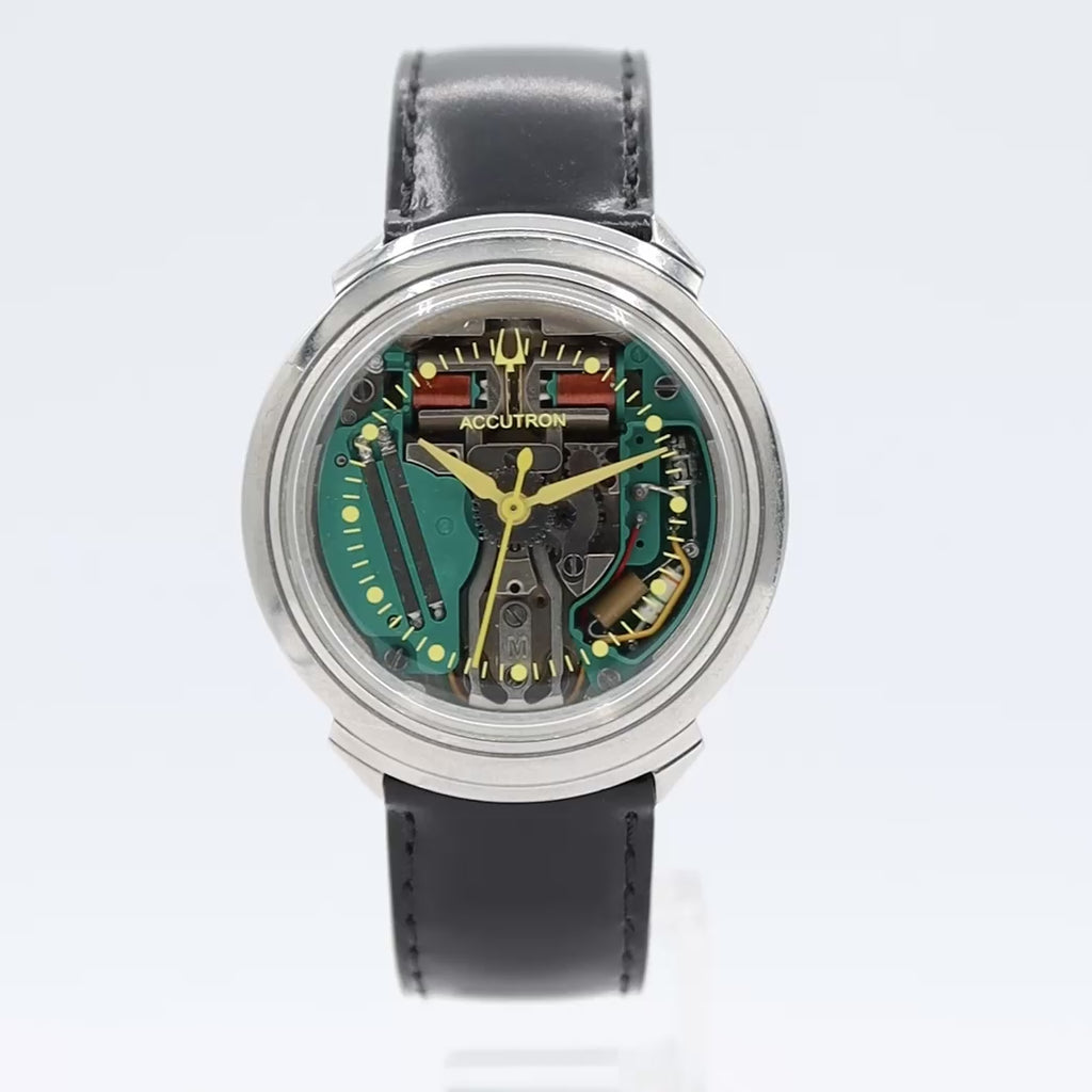 Additional Information: The Spaceview is a highly collectible Accutron model known for its transparent dial that exposes the electronic tuning fork movement and coils. Its "N1" date code indicates a production year of 1971. Key characteristics include a continuous, smooth sweeping second hand, a distinctive humming sound instead of ticking, a battery-powered design, and unique features like the absence of a manual winding stem, with time setting located on the back. This model from 1971 was known for its accuracy, which was trusted by NASA for use in spacecraft.