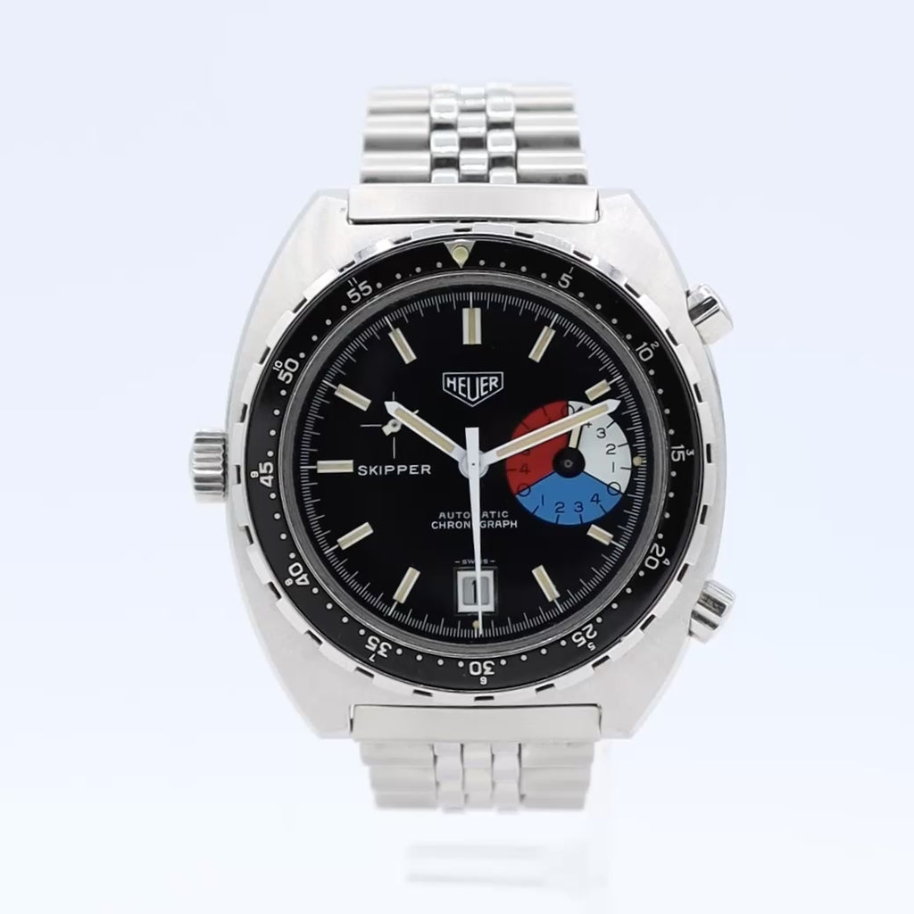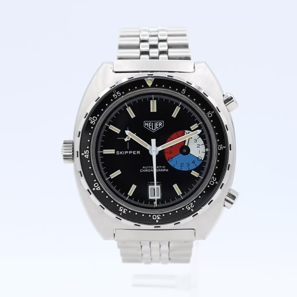 - Additional Information: The vintage Heuer Skipper with Calibre 15 is a sought-after automatic chronograph from the 1970s, recognized for its distinctive blue dial and 15-minute yachting regatta countdown timer. These watches were typically housed in the same large, stainless steel "C-shape" case as the Heuer Autavia of the era and carried the reference number 15640