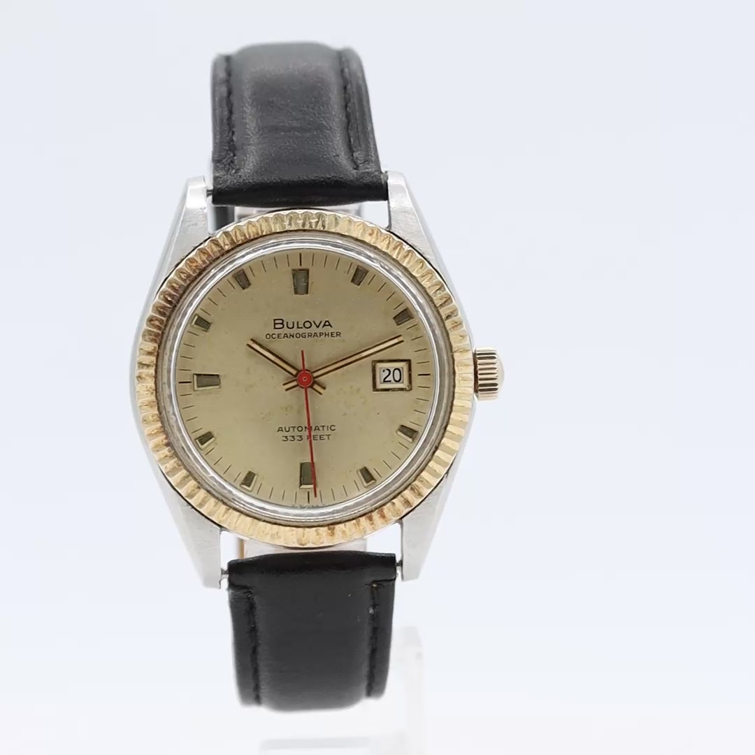 • Additional Information: This 1971 Bulova Oceanographer reference "J-3055" is a vintage men's automatic watch, one of several Oceanographer models from the late 1960s and early 1970s. It is characterized by its automatic movement and elegant design. Water resistant up to 333 Feet, this praticular model features a 10k Gold gold fluted bezel.