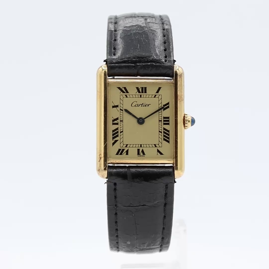 Additional Information: The Cartier Tank Vermeil reference 6 81008 is a classic quartz wristwatch from the "Must de Cartier" line, featuring a rectangular, gold-plated sterling silver case and blue crystal on crown.