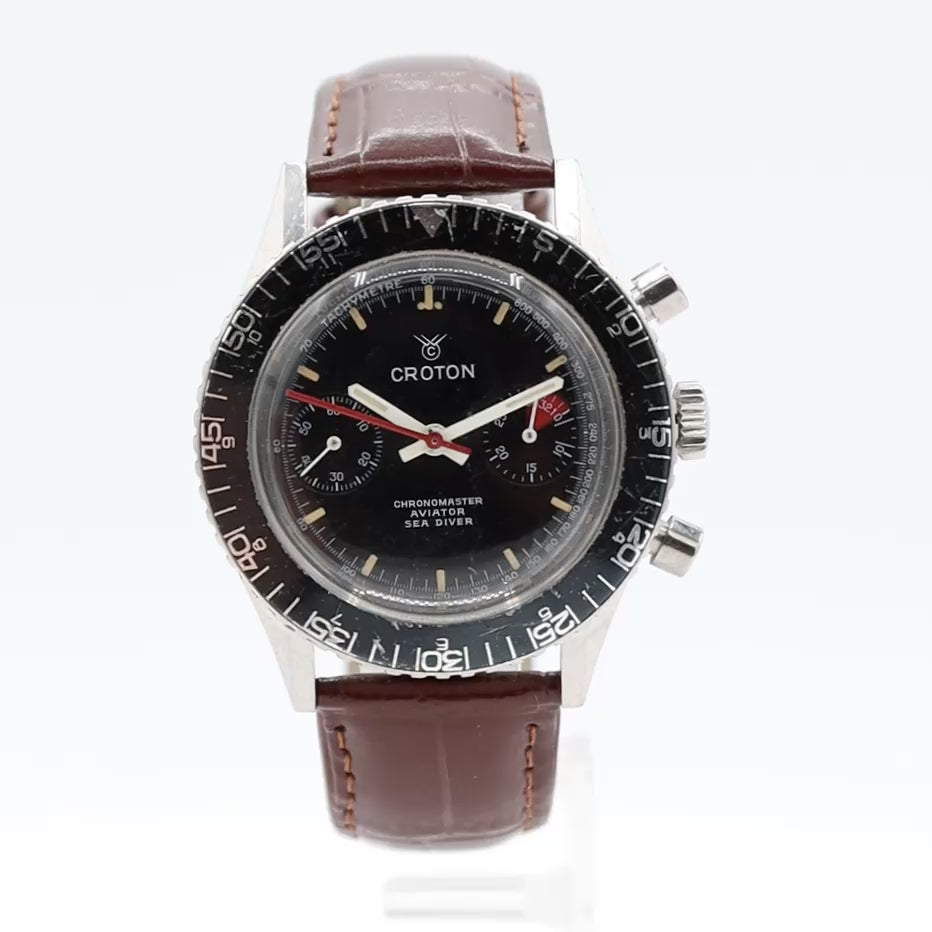 Additional Information: Serviced. The Croton 105 Chronomaster is a vintage tool watch from the 1960s, powered by a manually wound Landeron 248 chronograph movement. The watch was produced in various configurations by Croton, the American distributor for the Swiss brand Nivada Grenchen. It was marketed as the "world's busiest watch" due to its multi-functional design for racing, flying, and diving