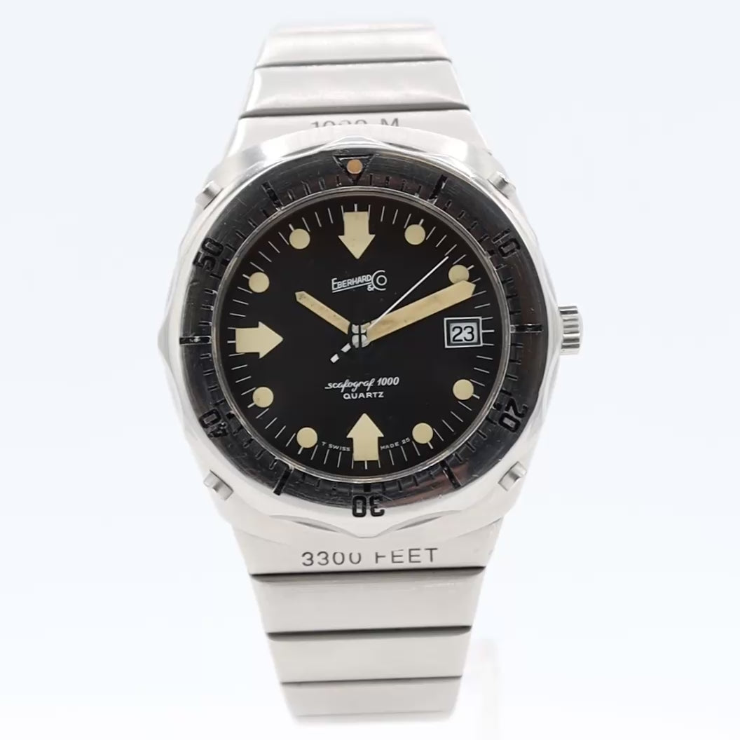 Additional Information: The Eberhard & Co. Scafograf 1000 is a vintage diver's watch, originally produced by the Swiss luxury watchmaker Eberhard & Co. in the 1980s. It is highly sought after by collectors and known for its 1000-meter water resistance and use of a quartz movement.