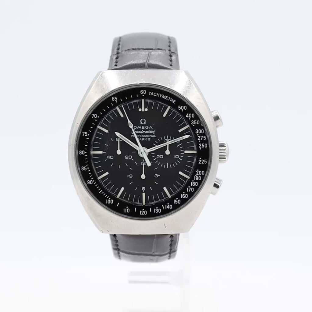 Additional Information: The Omega Speedmaster Mark II ref. 145.014 is a 1970 Speedmaster model with a barrel-shaped, tonneau-style case that replaced the classic Moonwatch design. It features a manual-wind Caliber 861 movement, a matte black dial luminous hands and indices, and a tachymeter scale printed on the underside of the flat mineral crystal.