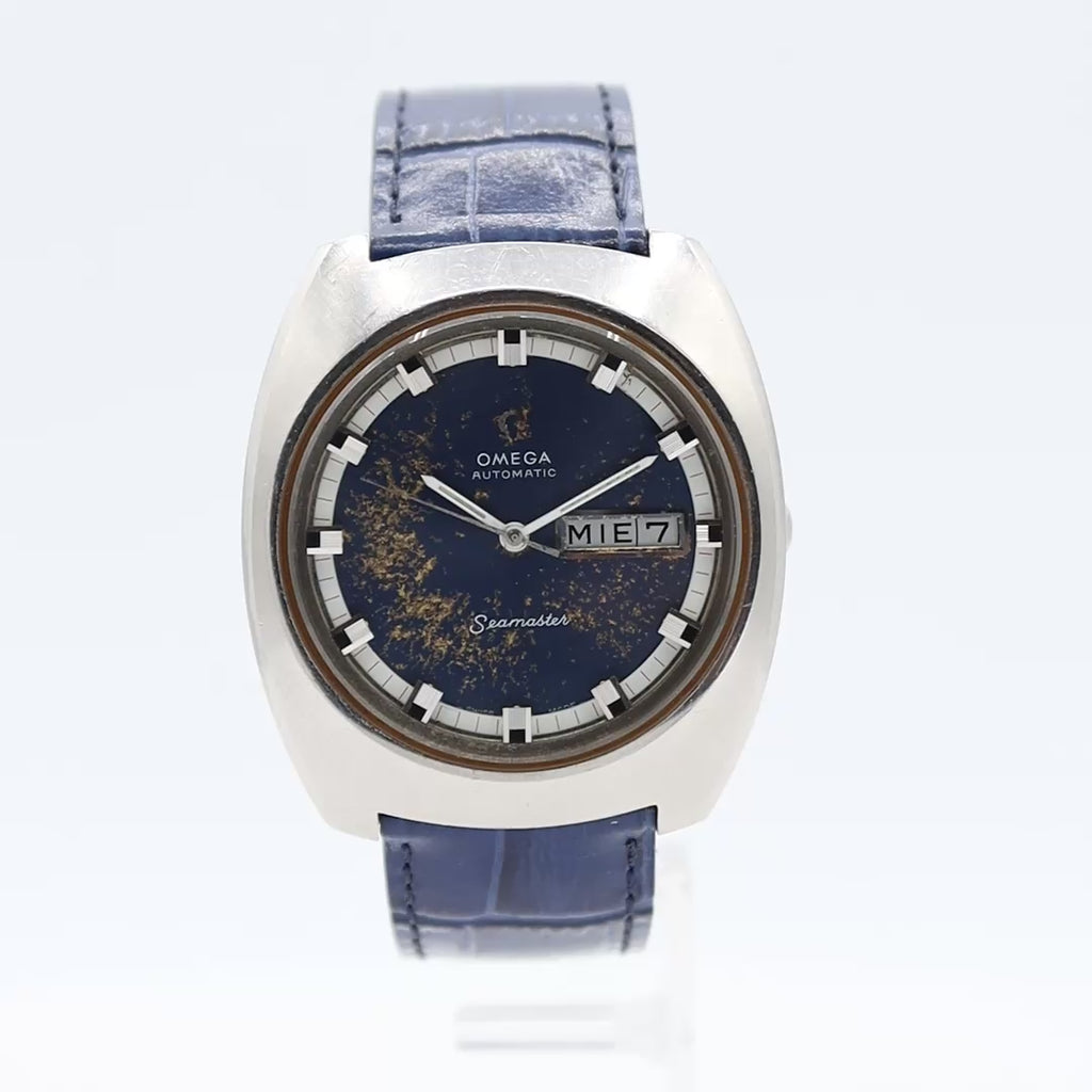 Additional Information: The Omega Seamaster 166.111 is a vintage stainless steel, self-winding automatic watch from the 1970s featuring a day and date complication at the 3 o'clock position. It is characterized by its tonneau-shaped case (around 39-44mm), a blue dial, baton hour markers, and an Omega Caliber 752 movement with 24 jewels. A key feature is the screw-down caseback with the Seamaster seahorse logo.