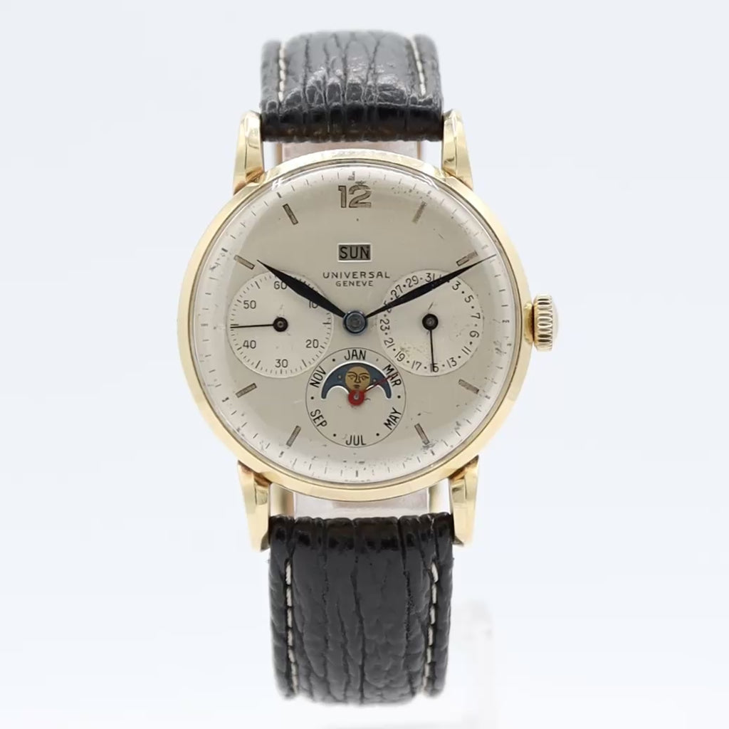 - Additional Information: Universal Geneve reference 51307 is a vintage triple date moon phase wristwatch from the 1946. Featuring a 14k gold case and a manual-winding movement. It is known for its elegant design and significant complications. Powered by a signed, manual-winding Caliber 291 movement, which was developed by Martel and Universal Geneve, it is considered a dressy and sophisticated timepiece.