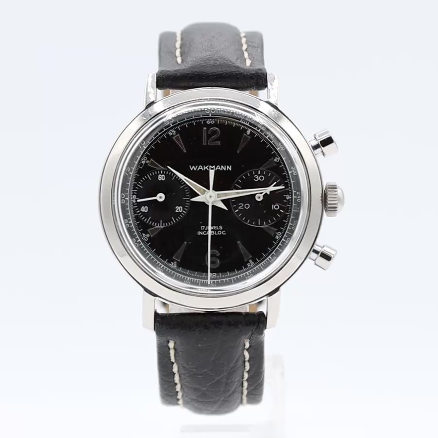 Additional Information: The 1960s Wakmann Chronograph, crafted in France with Swiss components. Featuring a stunning original dial with shark-tooth markers, a tachymeter, and a smooth operating Wakmann Venus 188 movement, this hand-wound beauty exudes sophistication. With its large 37mm case and outstanding condition for its age, this collectible piece is a must-have for enthusiasts seeking both style and quality.